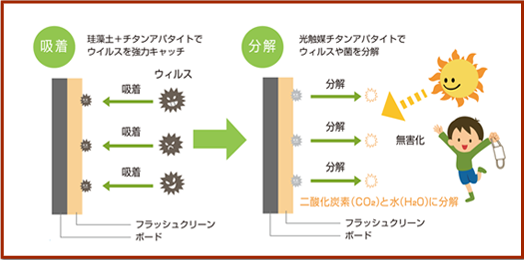 『光エネルギー』でウィルスや細菌、悪臭のもとを水と二酸化炭素に分解する光触媒チタンアパタイト。吸着力に優れ、空気中の湿度とともに、有害物質も強力に吸着する珪藻土。この二つが融合し、有害物質を吸着・分解。壁や天井で24時間、メンテナンスフリーで室内の空気を清浄化してくれます。 |